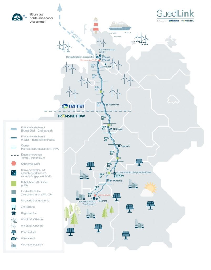 Mit rund 700 Kilometern Länge und vier Gigawatt Übertragungskapazität ist SuedLink ein zentrales Infrastrukturvorhaben der Energiewende in Deutschland. Die Leistung entspricht etwa vier Atomkraftwerken. Rechnerisch können damit rund zehn Millionen Haushalte mit Strom versorgt werden.